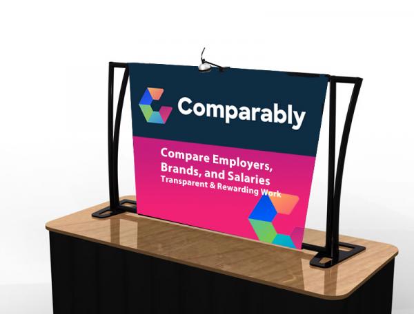 There are table top displays and then there are Aero Table Tops. Portable Aero Table Tops combine a lightweight aluminum frame with vibrant tension fabric graphics into 14 remarkable designs. Every Aero assembles without tools using push-button connectors and packs in a convenient case with a handle and wheels.