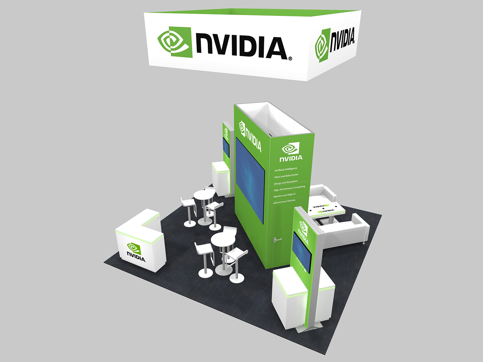 Quite often, a few custom elements added to the design can give the entire design a custom look even if it’s as simple as some colorful laminated workstations, shelves, or a reception counter. Custom laminated soffits and backlighting are also nice touches that are inexpensive and well worth the investment. As a bonus, if you re-rent the same exhibit, your second rental will most likely be less expensive, since your first rental covered the cost of those custom components.