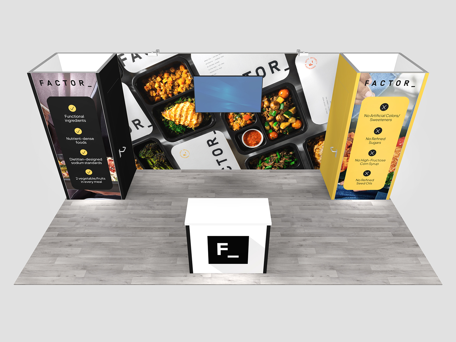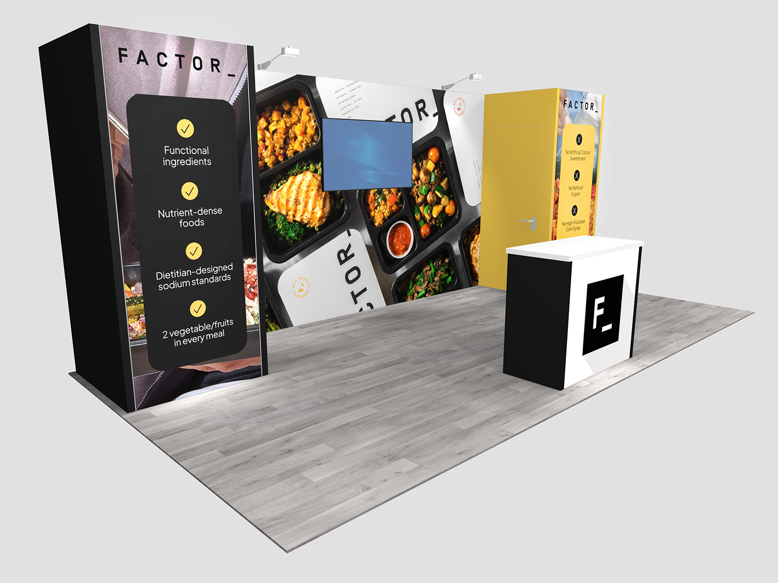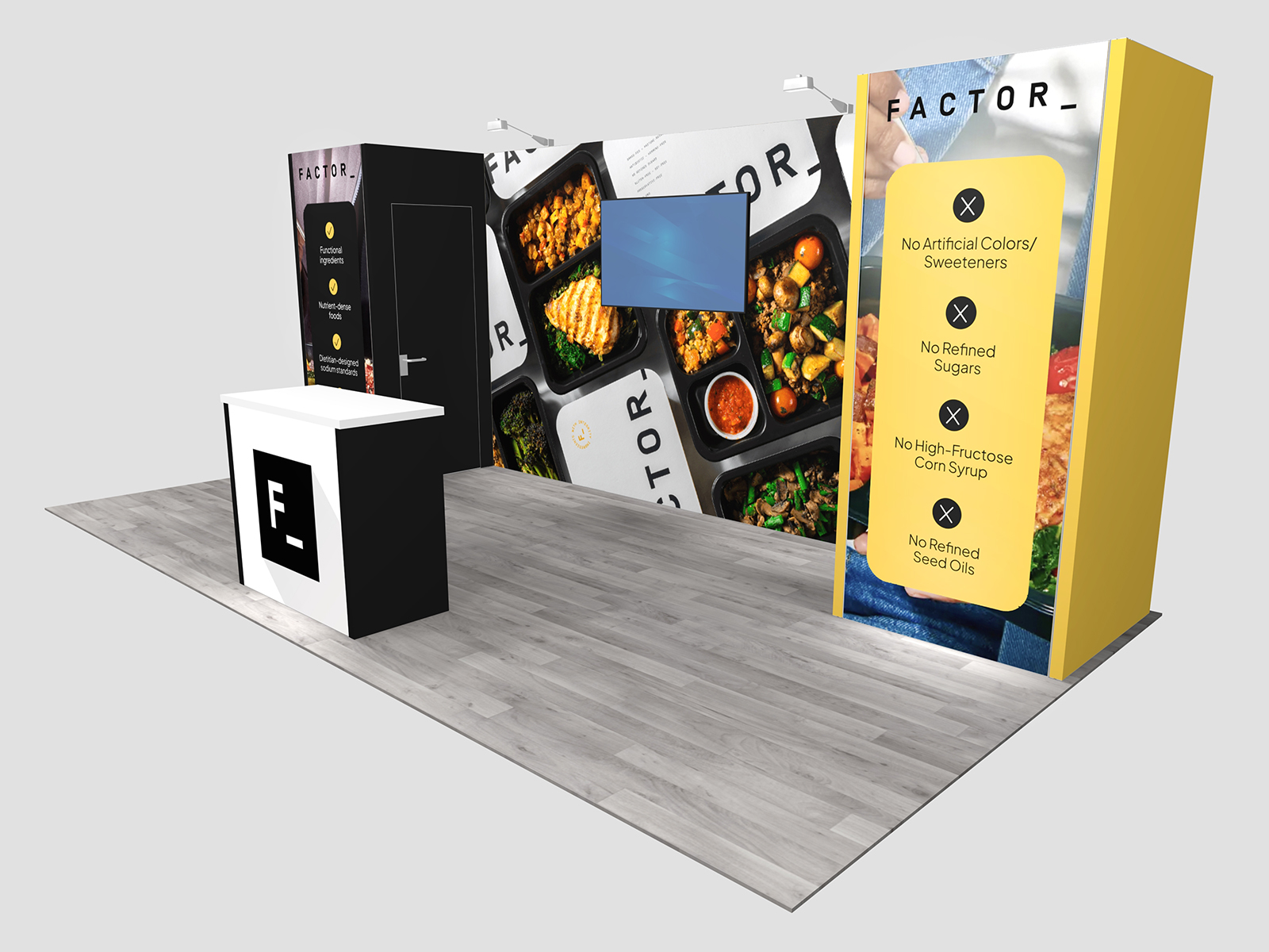 Quite often, a few custom elements added to the design can give the entire design a custom look even if it’s as simple as some colorful laminated workstations, shelves, or a reception counter. Custom laminated soffits and backlighting are also nice touches that are inexpensive and well worth the investment. As a bonus, if you re-rent the same exhibit, your second rental will most likely be less expensive, since your first rental covered the cost of those custom components.