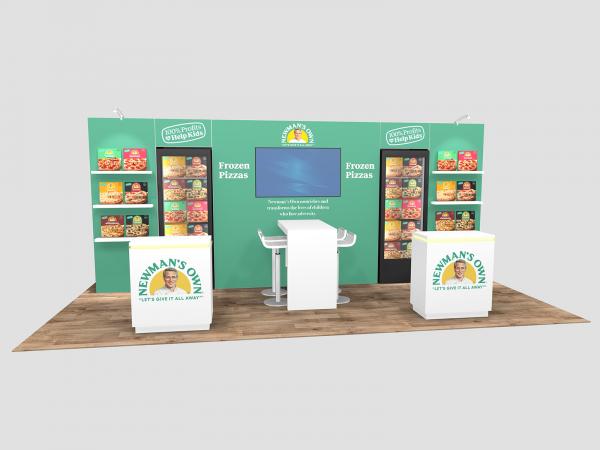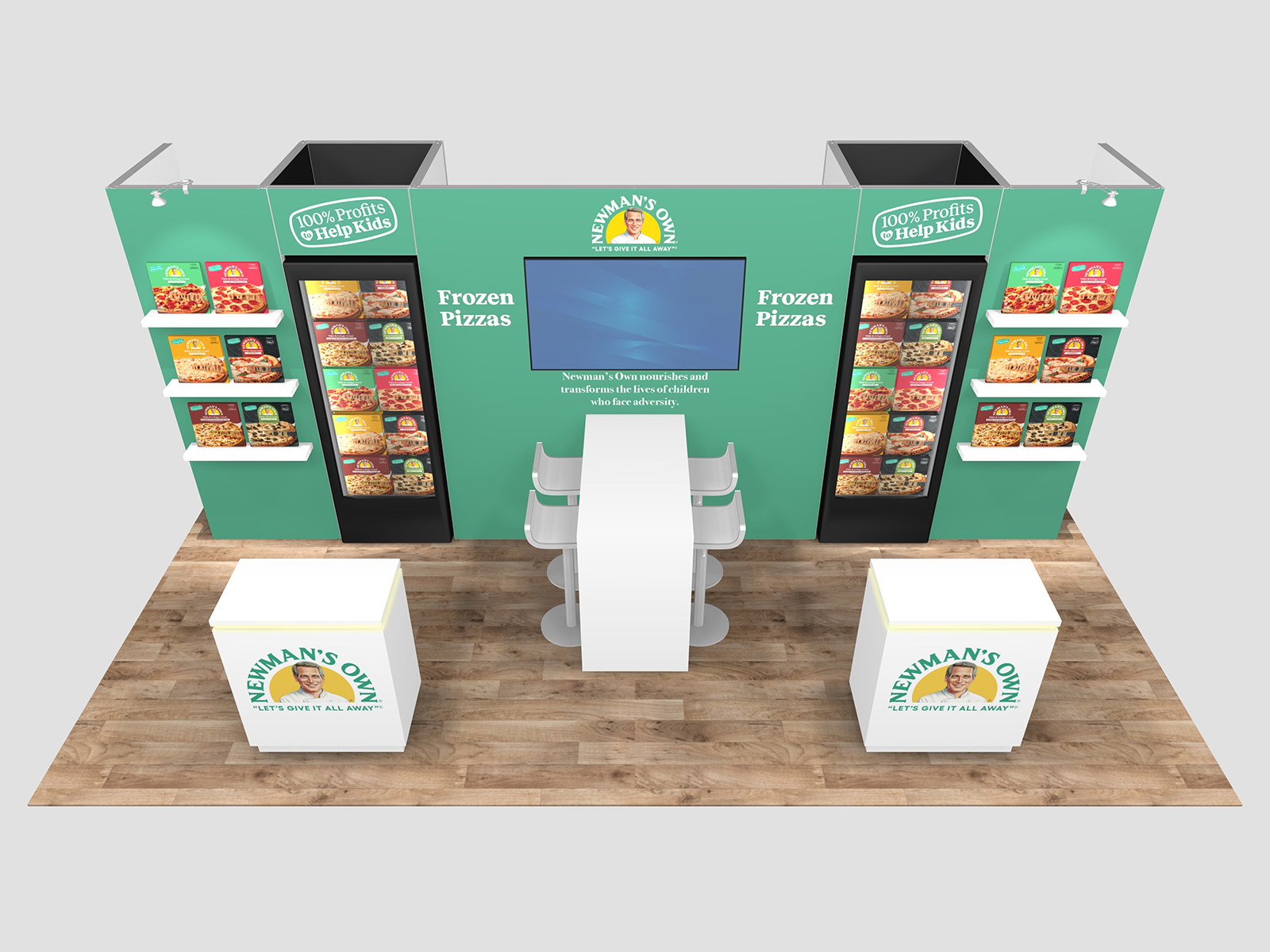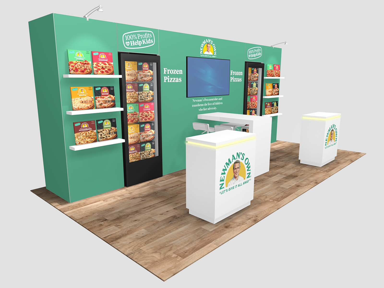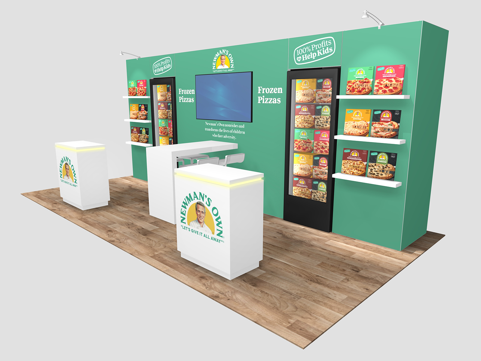 These beautiful and practical 10 x 20 exhibits blend product displays, sampling options, bold graphics, and multi-media video into a cohesive visual presentation. They include extensive shelves, large format fabric and direct print graphics, LED accent lights, and even space for refrigerators (RE-2175 and RE-2177). The Gravitee Modular System ensures every setup is quick and easy, the custom counters are fully assembled, and the SuperNova Lightboxes (RE-2176) assemble without tools.