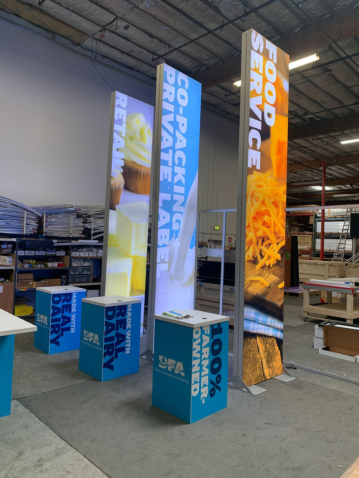 Custom Inline Exhibit with SuperNova Backlit Lightboxes, (4) Product Shelves, Storage Closet, Fabric and Direct Print Graphics, Reception Counter w/ Open Storage, and Counter w/ Locking Storage and Wireless Charging Pads [ORD-69079]