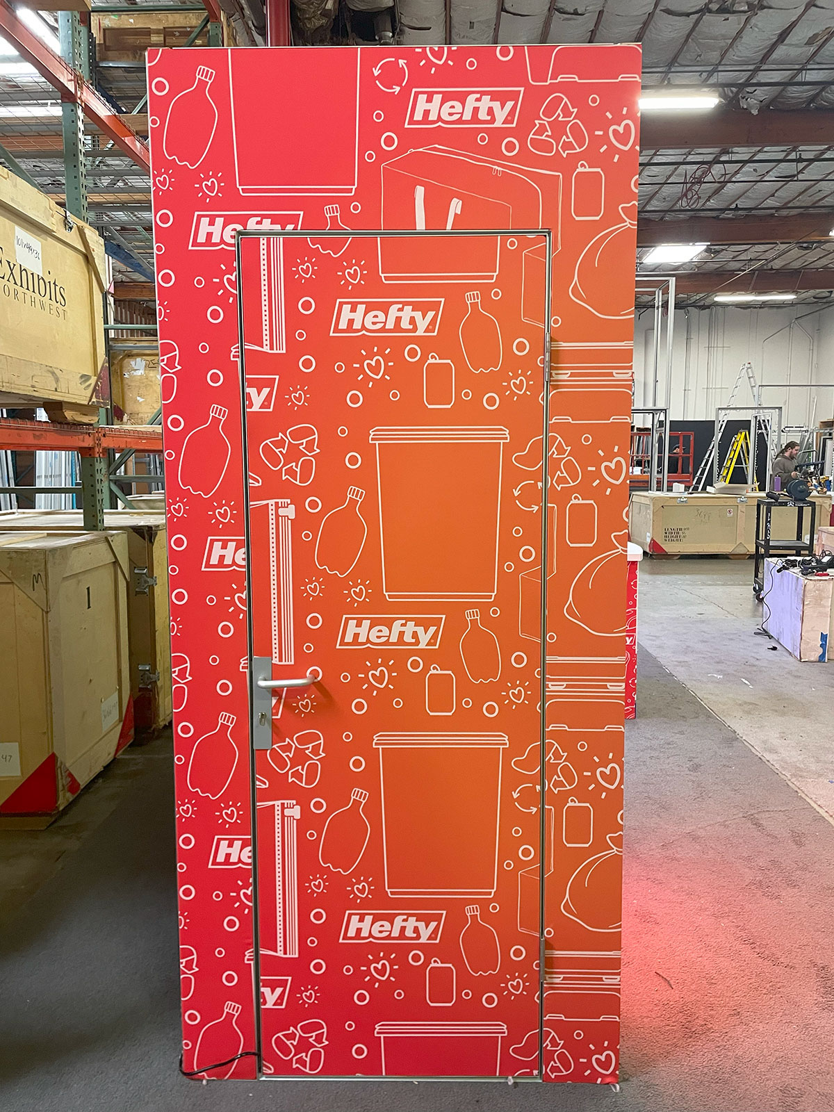Modified ECO-2038 Sustainable Exhibit with Shelves, Locking Closet, Lightbox, SEG Fabric Graphics, Monitor Mount, and MOD-1590 Backlit Reception Counter with Locking Storage [ORD-69141]