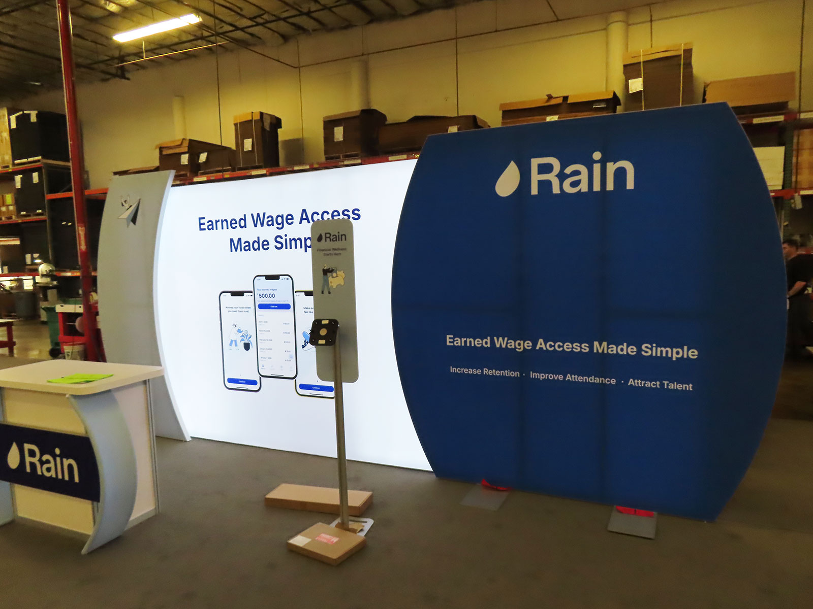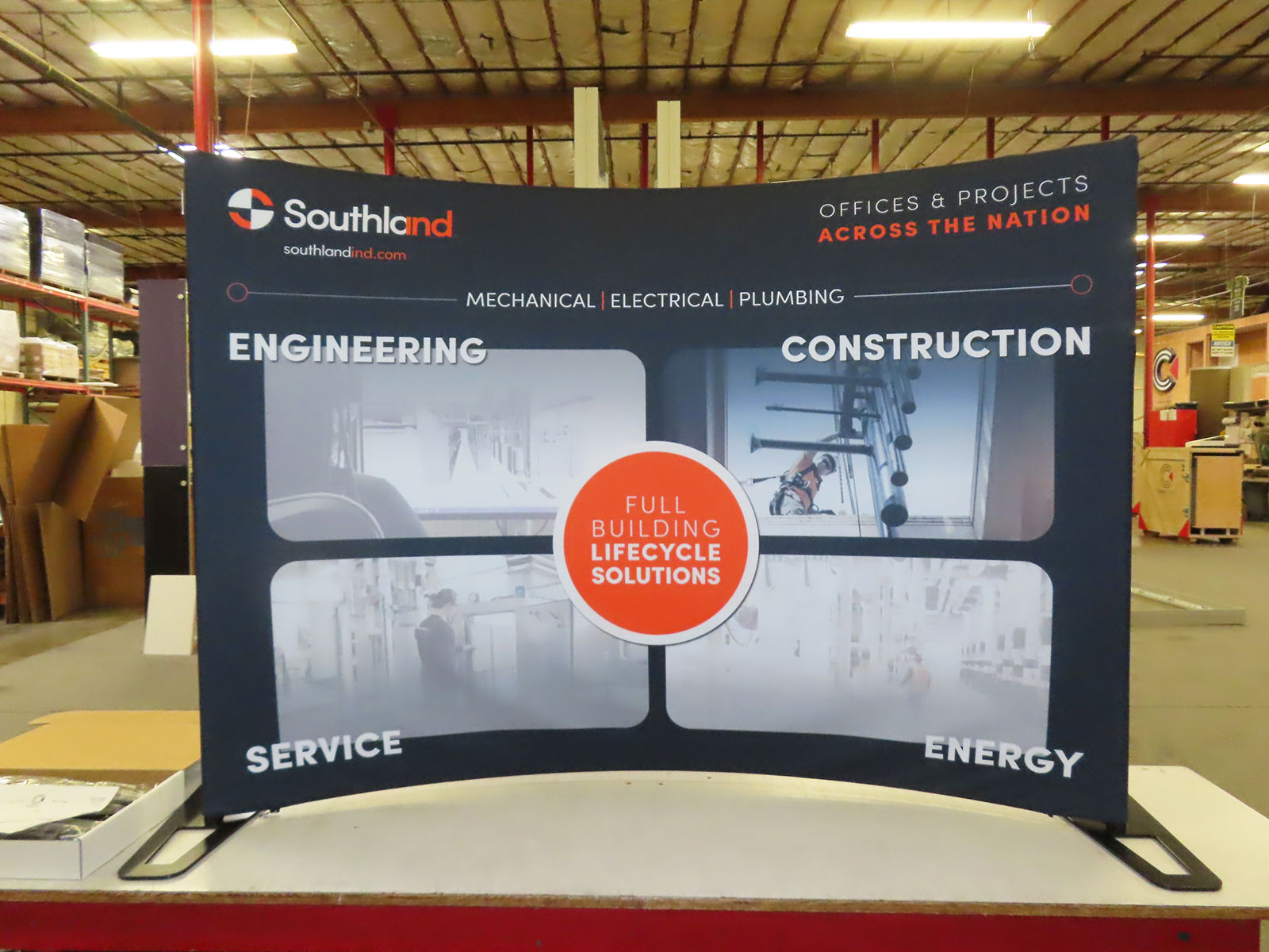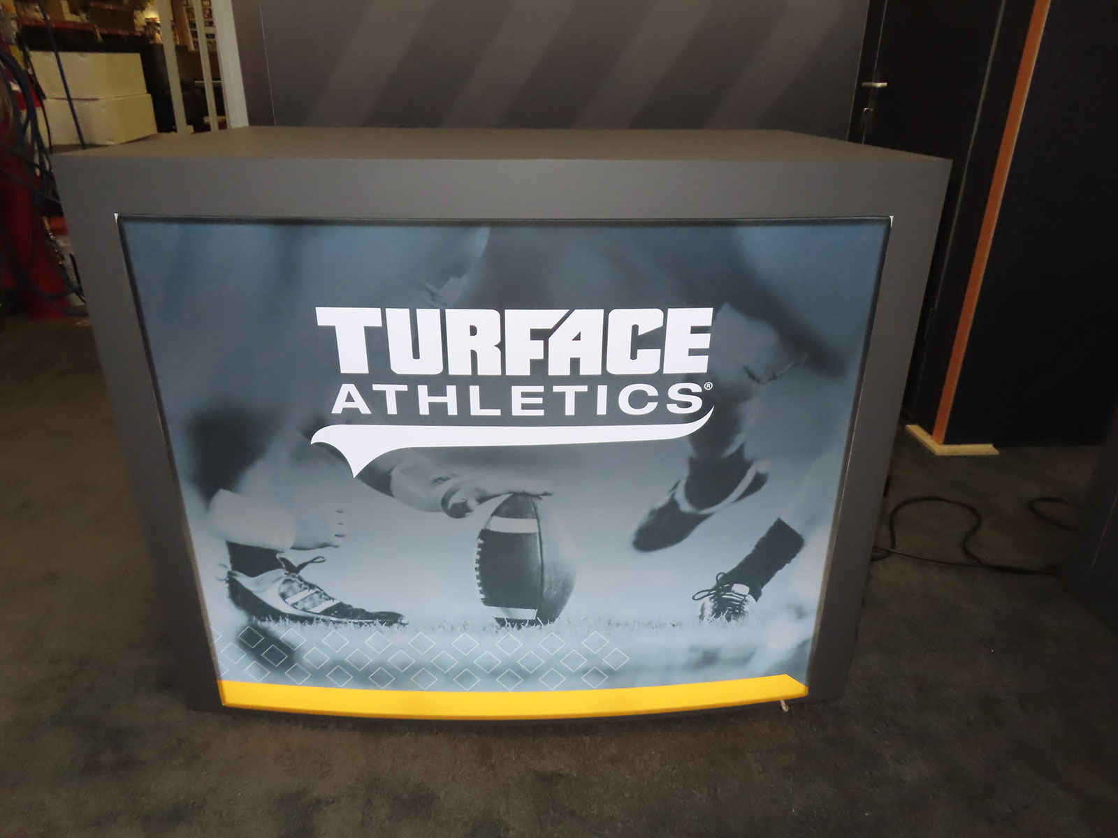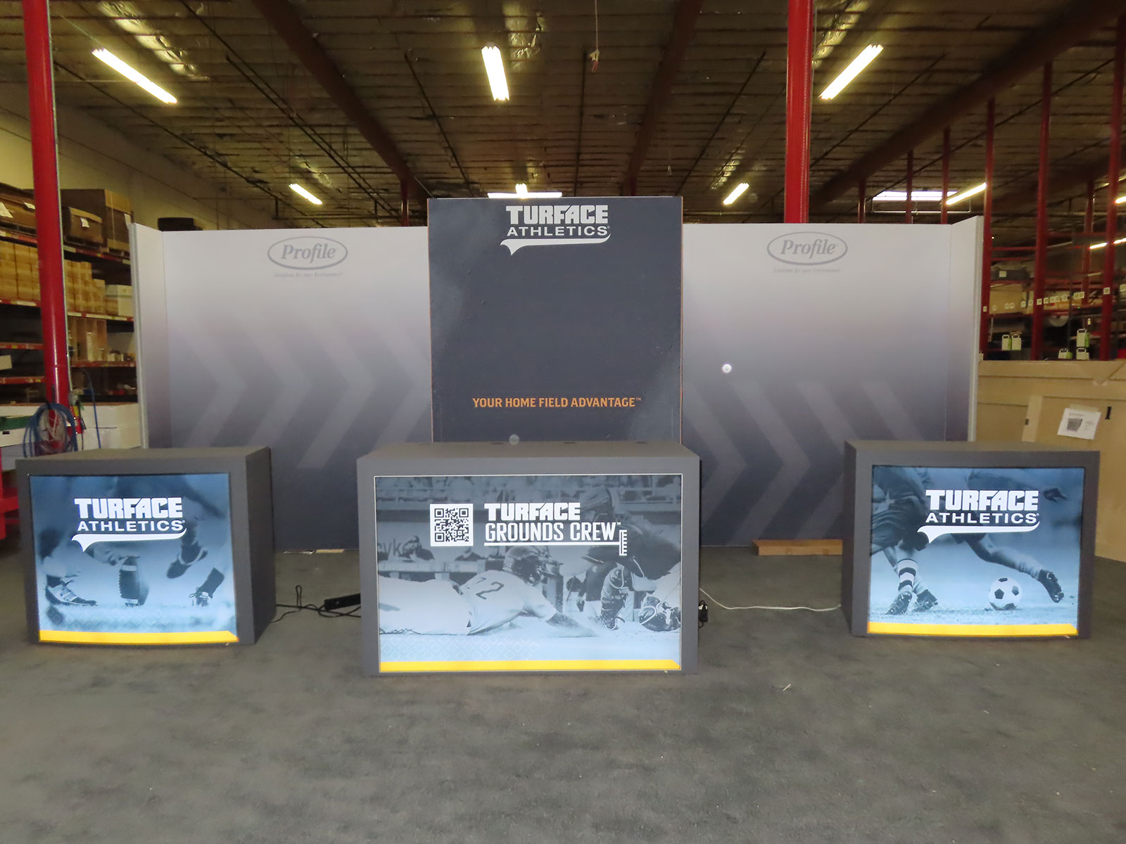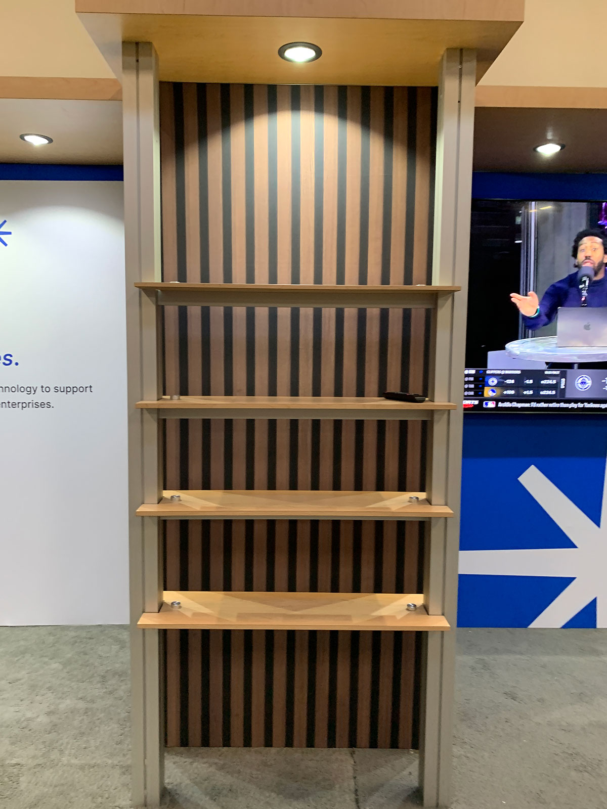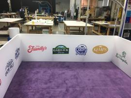 RENTAL: Modified RE-2103 Inline Design with Gravitee Panel System Backwall, Custom Hardrock Maple Laminated Soffits with Recessed Puck Lights, Extrusion Supported Laminated Shelving, Large Monitor Mount, 85" Monitor with HDMI Cable, SEG Fabric Graphics [ORD-69166]