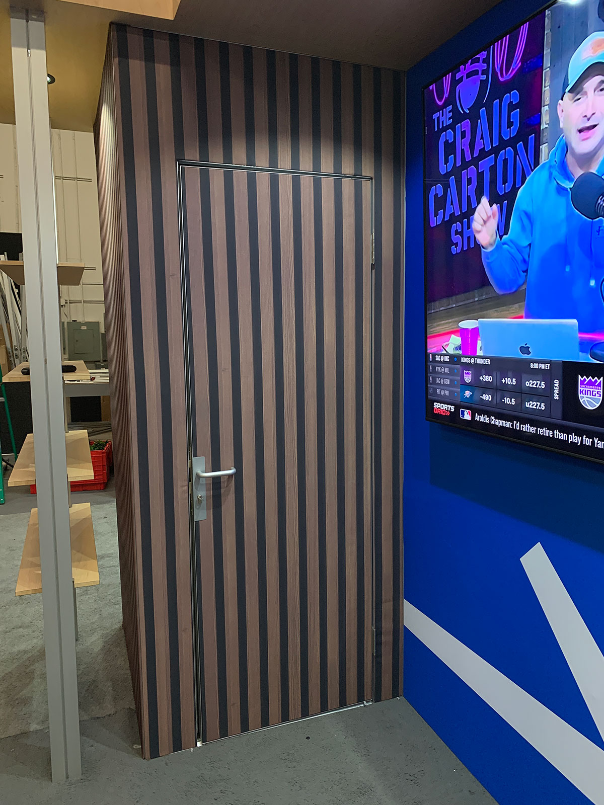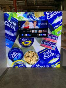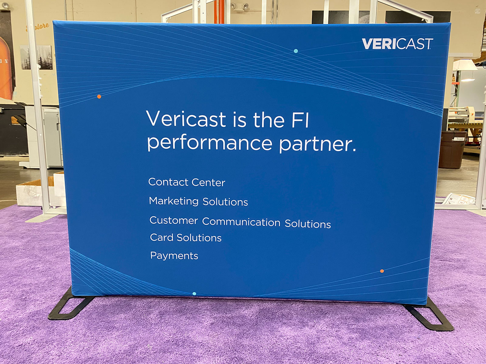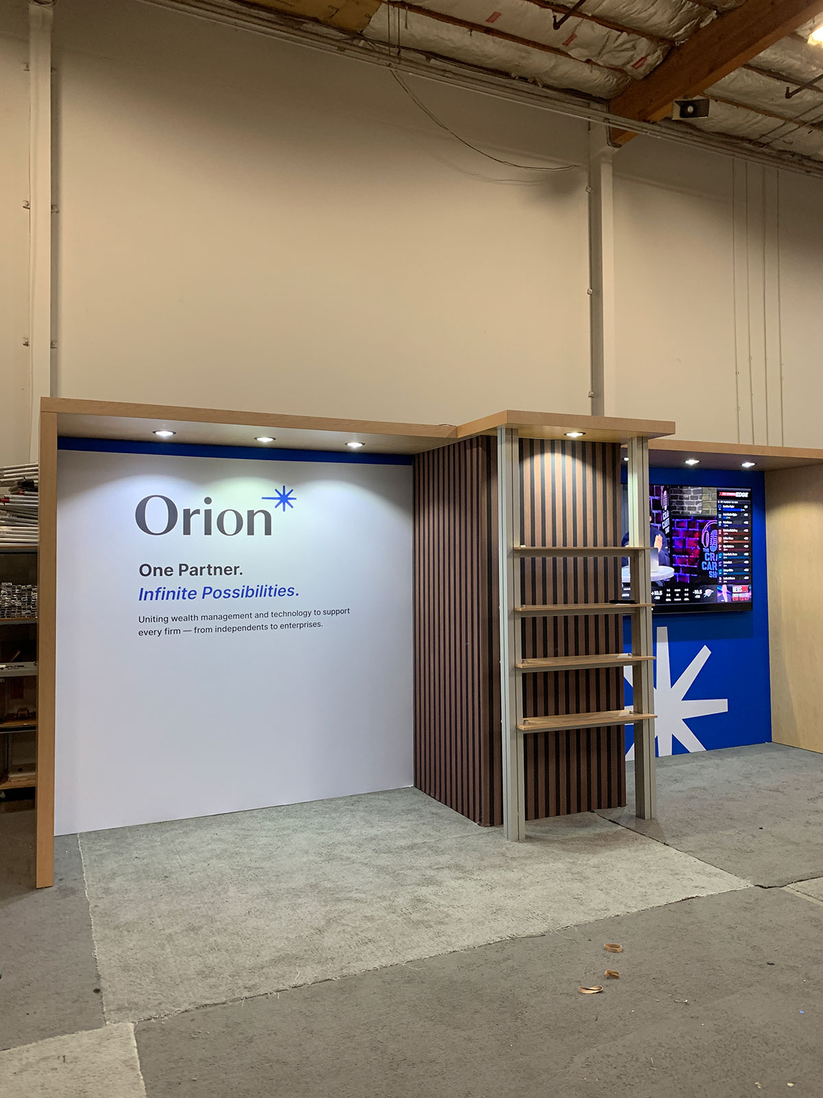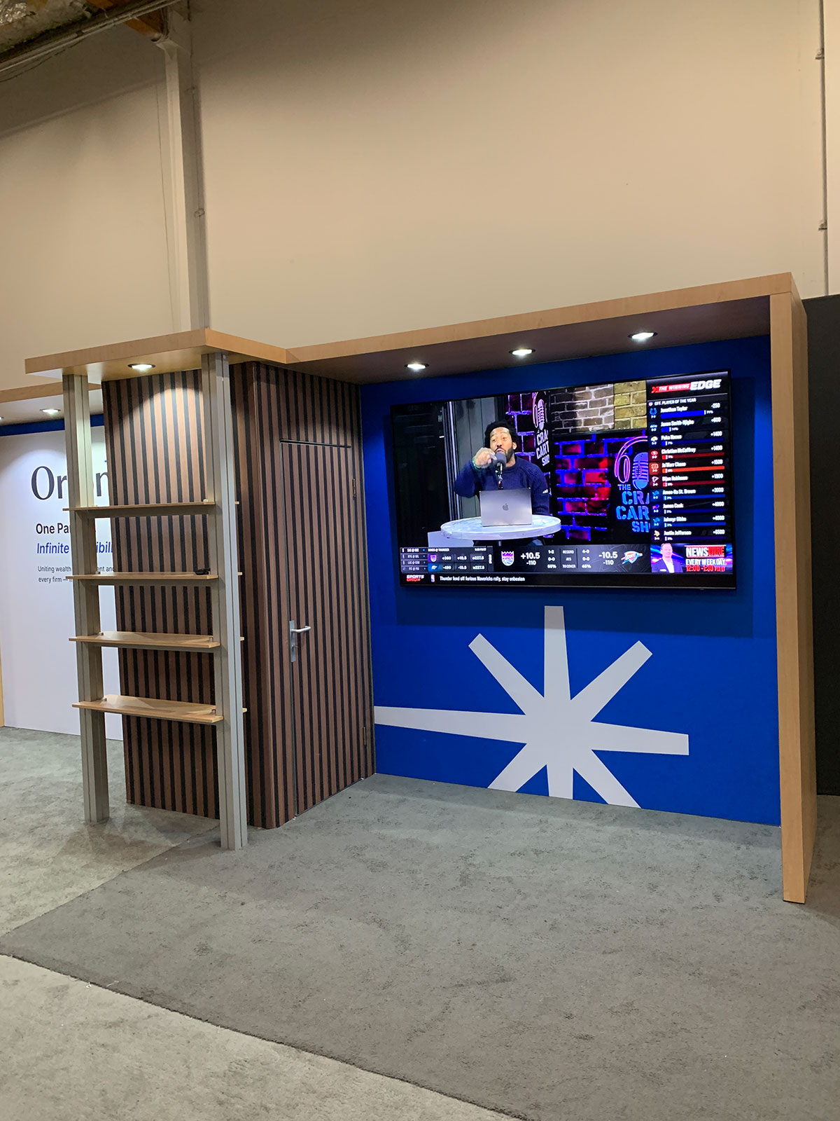 RENTAL: Modified RE-2103 Inline Design with Gravitee Panel System Backwall, Custom Hardrock Maple Laminated Soffits with Recessed Puck Lights, Extrusion Supported Laminated Shelving, Large Monitor Mount, 85" Monitor with HDMI Cable, SEG Fabric Graphics [ORD-69166]