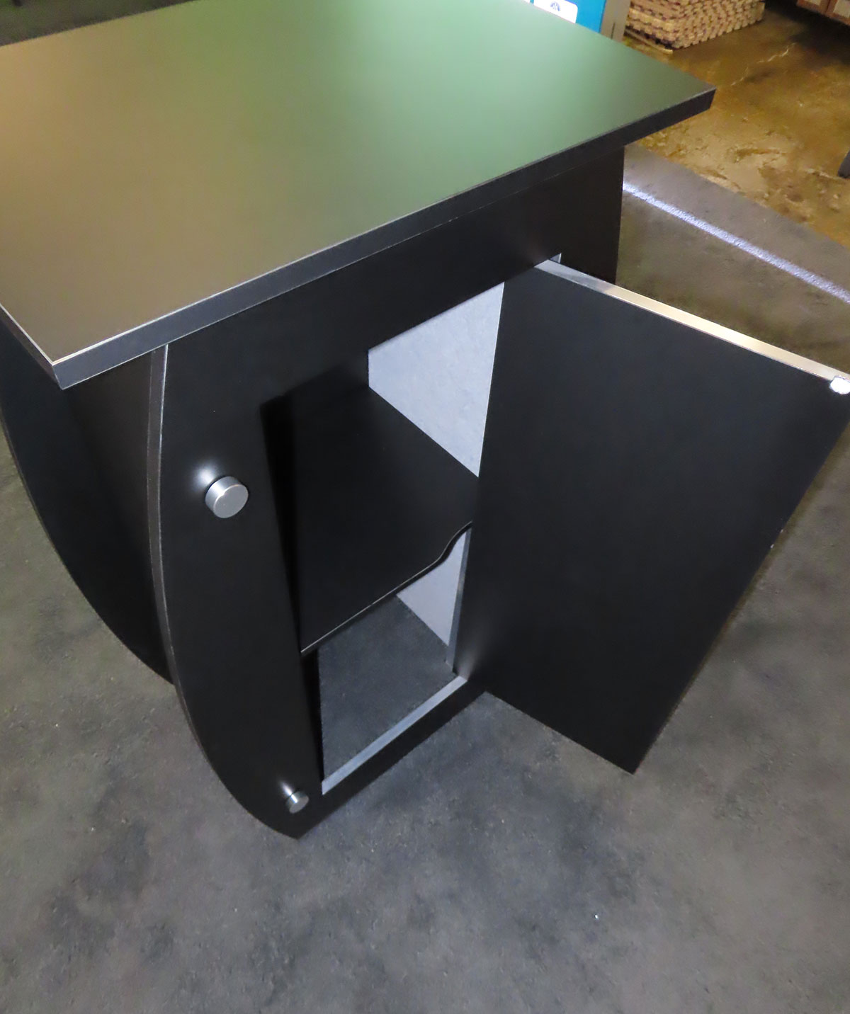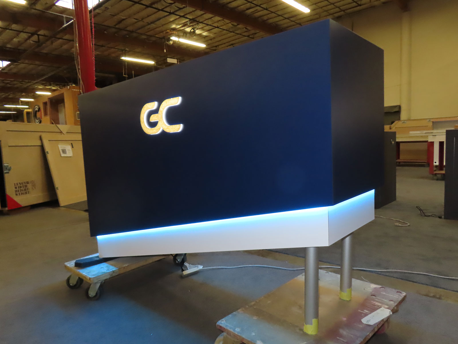 Custom Product Display Counter with Backlit Logo and LED Accent Lights, Locking Storage, and Plex Display Case Custom Product Display Counter with Backlit Logo and LED Accent Lights, Locking Storage, and Plex Display Case