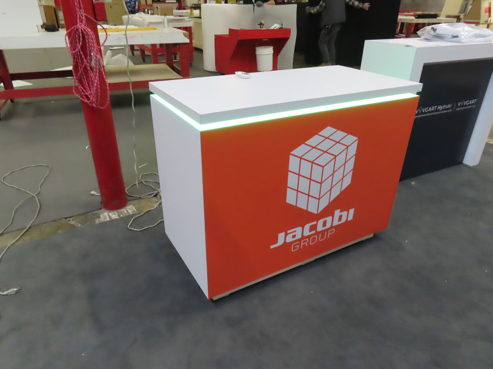 Modified VK-1340 Custom Exhibit with Backlit SEG Fabric Graphic and MOD-1563 Counter with LED Accent Lights and Locking Storage [ORD-70409]