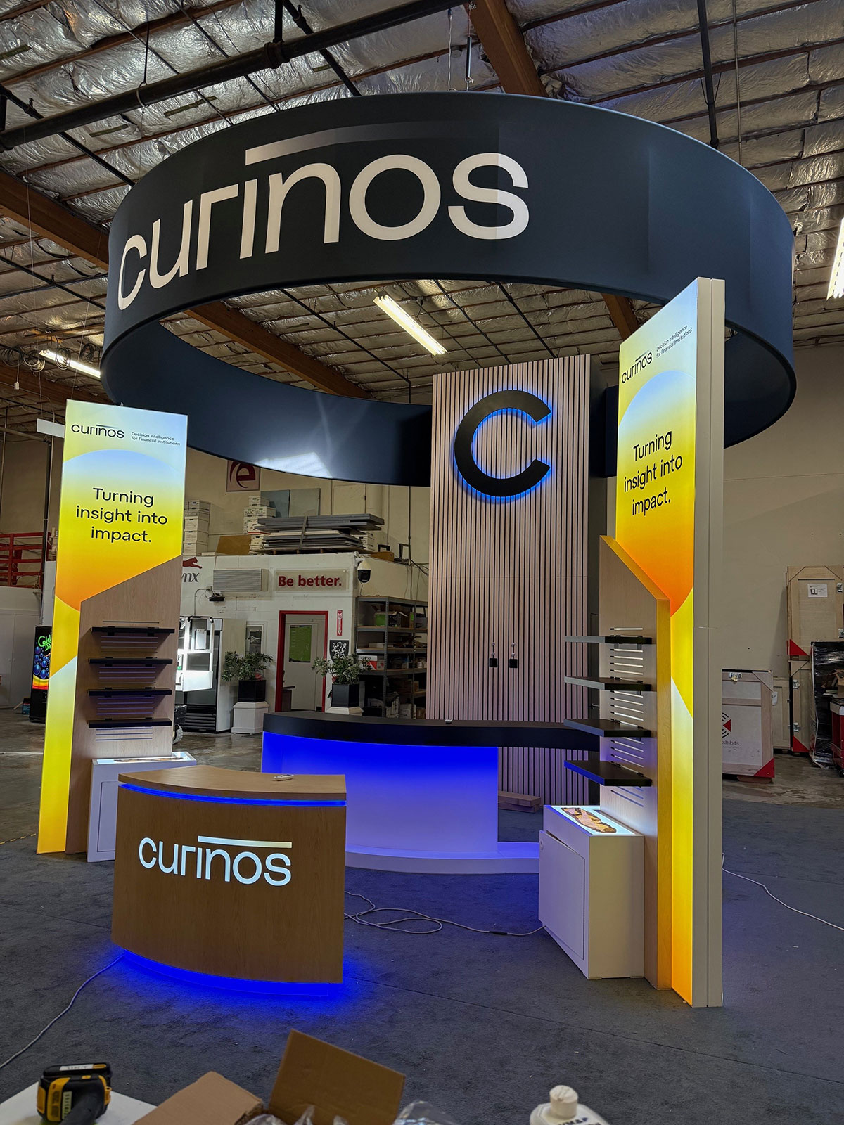 RENTAL: Modified RE-9097 Island Design with 16 ft. High Curved Gravitee Walls, 65" Monitor with HDMI Cable, 55" Monitor with HDMI Cable, RE-1597 White Laminated Curved Counter, SEG Fabric Graphics, and Direct Print Vinyl Applied Graphic RENTAL: Modified RE-9097 Island Design with 16 ft. High Curved Gravitee Walls -- View 2 RENTAL: Modified RE-9097 Island Design with 16 ft. High Curved Gravitee Walls -- View 3 RENTAL: Modified RE-9097 Island Design with 16 ft. High Curved Gravitee Walls -- View 4 RENTAL: Modified RE-9097 Island Design with 16 ft. High Curved Gravitee Walls -- View 5 RENTAL: Modified RE-9097 Island Design with 16 ft. High Curved Gravitee Walls -- View 6 RENTAL: Modified RE-9097 Island Design with 16 ft. High Curved Gravitee Walls -- View 7 RENTAL: Modified RE-9097 Island Design with 16 ft. High Curved Gravitee Walls -- View 8